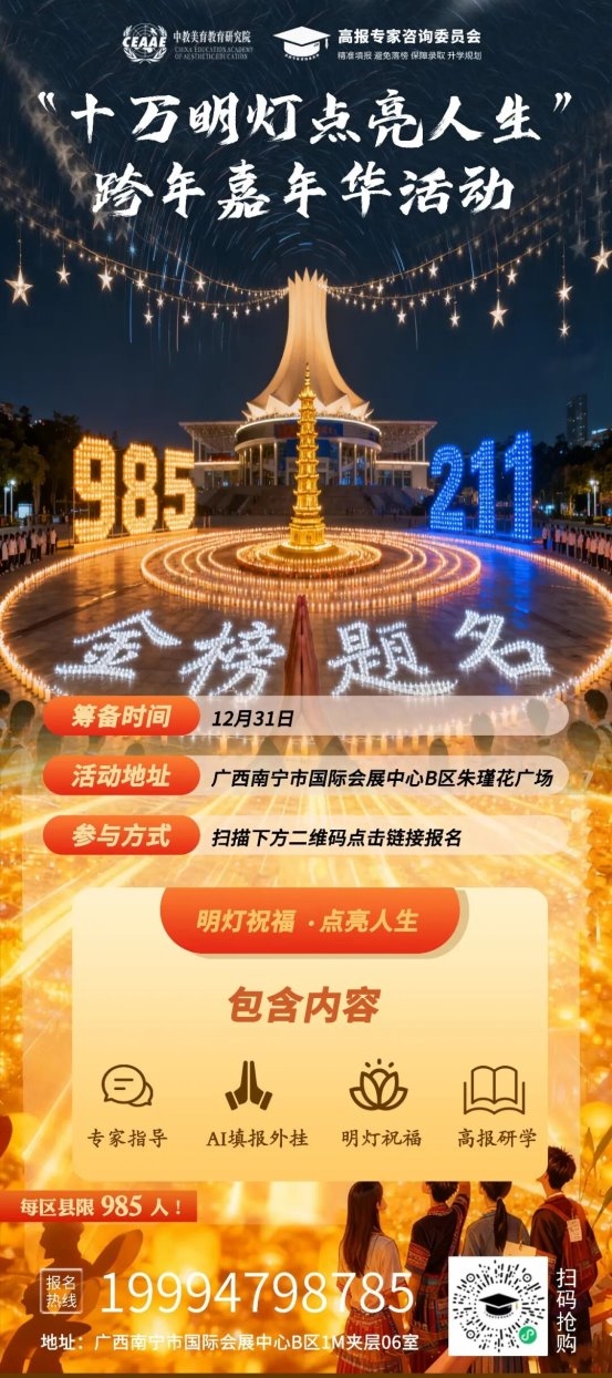 据美育专家、全国高报专家、中国首席就业咨询专家、中教美育教育研究院院长、活动组织负责人邓素云介绍,高三学生正处于人生的关键时期,他们不仅面临着巨大的学习压力,情绪波动也较大。为了帮助高三学生缓解压力、调整心态,同时也为了给他们提供一个展示自我、交流互动的平台,“十万明灯点亮人生”跨年嘉年华系列活动特别为高三学生及其家长推出了一系列优惠福利。只需花费398.5元报名参加此次活动,学生及其家长就可获得价值598元的志愿卡,这张志愿卡将为学生在高考志愿填报方面提供专业的指导和建议,帮助他们选择适合自己的大学和专业;还可获得价值1985元/年的高报专家社群vip,在社群中,学生和家长可以与高报专家进行实时交流和互动,获取最新的高考资讯和报考技巧;每天还能收到最新最GEN最实用的教育部、考试院的高考资讯,让学生及时了解高考动态,调整学习策略;更有超有料的“广西非遗 + 东盟文化体验”广西文旅大礼包,让学生在感受文化魅力的同时,放松身心,缓解压力。更重要的是,每报名1人,组委会将捐赠10元用于公益助学金。这意味着,孩子们在收获祝福和欢乐的同时,也能为公益事业贡献一份自己的力量。这不仅是一场祈福活动,更是一次爱心传递的行动。通过这次活动,让孩子们懂得关爱他人、奉献社会,培养他们的社会责任感和公益意识。