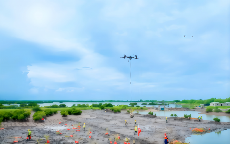 此外,在项目546公顷的广阔修复区域中,由于远岸区域难以涉足,传统人工作业效率堪忧。项目团队创新采用无人机投苗模式,精准投放甄选后的白骨壤、红海榄、桐花树等本地树苗,高效打通滩涂投苗的“最后一公里”,破解了远岸作业的核心难题。无人机与人工互相配合进行投苗、分苗、种苗,不仅有效规避了水上作业的安全风险,更极大提升了效率。最繁忙时,团队同时投入6台无人机,每台一次可吊运40株带泥球的种苗,一名熟练操作手日投苗量可达2000至3000株。