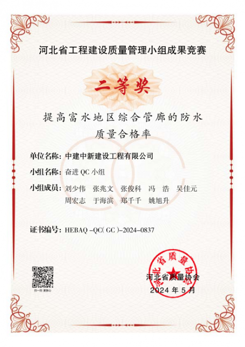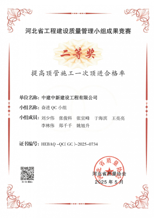 他不仅是一名技术规范的执行者,更是一位勇于探索的创新者。他积极参与项目科技目标成果转化工作,7年间,结合项目的实际情况,主导8项实用新型专利的研发工作,发表了2篇论文,其中论文《城市富水地层综合管廊变形缝质量管控与施工技术研究》及专利“一种墙式护栏修饰工具”分别获得2023年公司级优秀专利、论文。其个人的“一种湿接缝模板吊装工具”专利在2024年度山东省住建系统“五小”成果竞赛中获得一等奖,因此获得山东省“2024年全省劳动和技能竞赛先进个人”称号。在项目实践中,他始终积极投身QC小组工作,以解决工程实际痛点、提升施工质量与效率为核心目标,深度参与从课题选题、问题分析到方案落地的全流程。其中,2024年“提高富水地区综合管廊的防水质量合格率”获得省级QC成果二等奖;2025年“提高顶管施工一次顶进合格率”获得省级QC成果二等奖。