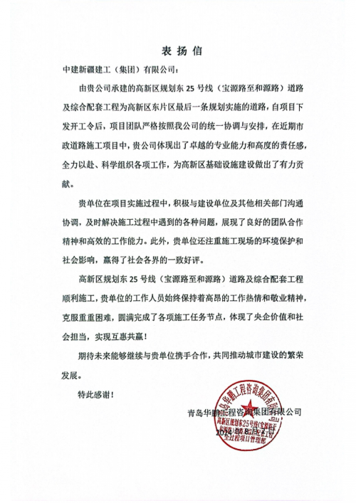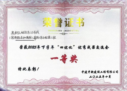 开工伊始,项目部协调各方资源迅速推进开工建设,展现“开局即冲刺、进场即决战”的攻坚姿态。为合理组织施工,项目采用“分区管控、流水施工”管理模式,将道路划分为4个工区同步推进。与地方政府、业主单位及各参建方紧密协作,精心策划施工方案,强化工序衔接,严格质量安全管控,确保了项目安全、优质、高效推进。最终项目顺利实现通车目标,跑出央企施工“加速度”,获得业主、监理单位的充分认可。施工期间获得表扬信2封,公司2024年度“优秀项目部”“工人先锋号”“青年文明号”等荣誉。