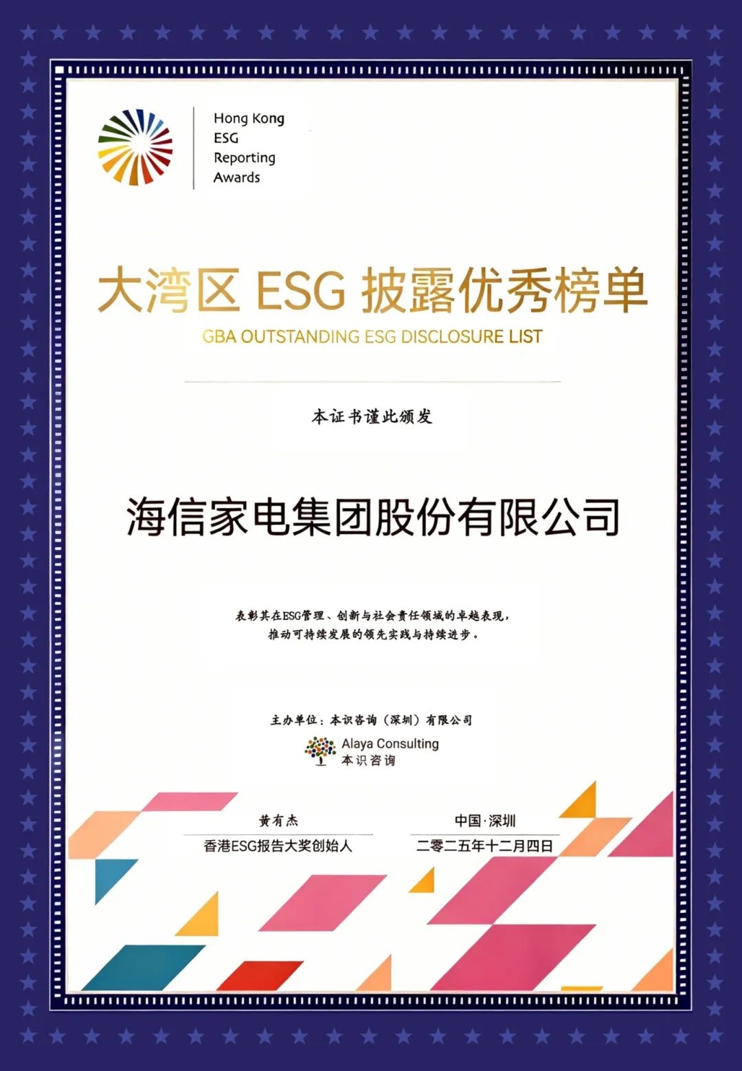近日,海信家电(SZ000921,HK00921)凭借在ESG发展方面的实践与履责表现,荣获“最佳A股ESG实践奖”,入选“大湾区ESG披露优秀榜单”。