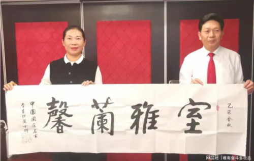 李乘伊院士赠送自己创作的 “ 室雅兰馨 ” 书法作品给四川省巴中市侨联党组书记、主席黄惠女士并合影留念