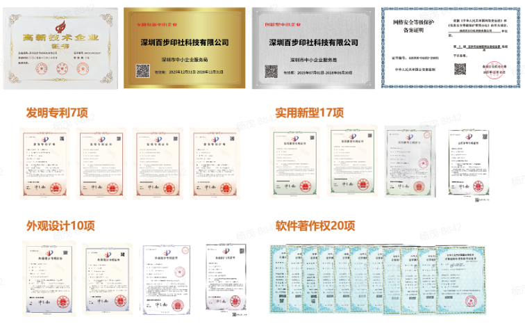 在产品研发方面,百步印社储备了便民自助打印相关的软硬件人才及专利技术,具备行业必须的网络安全等级保护备案证明(等保3级),ISO9001国际质量管理体系认证、3C国家强制性产品认证、IP65外壳防护等级认证、ICP、EMS(环境管理体系证书)、OHSMS(职业健康安全管理体系证书)等证书,是国家高新技术企业,是深圳市“专精特新”企业,是创新型中小企业。