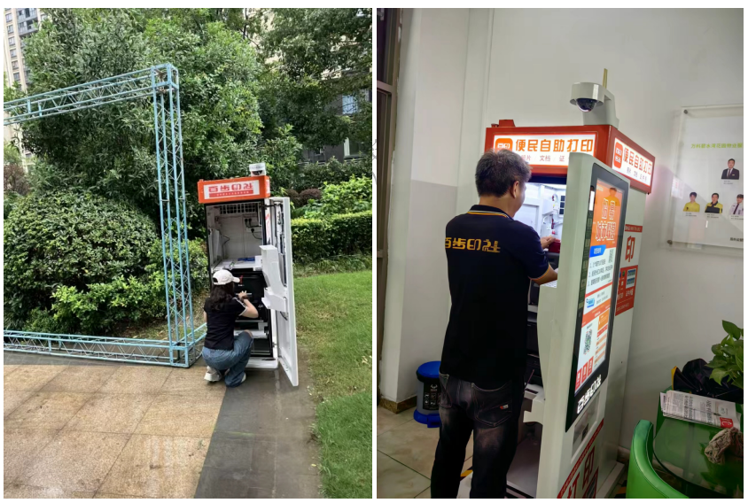 在设备运维方面,百步印社已在全国 30 个省级行政区、160 余座城市建立专属运维团队,提供上门检修、耗材补给、故障处理等全流程服务。设备占地不足 1㎡,防水防尘设计,可灵活部署于社区楼道、商场走廊、校园大厅等场景。统一运维调度机制大幅提升响应效率,确保便民服务不间断、可持续。
