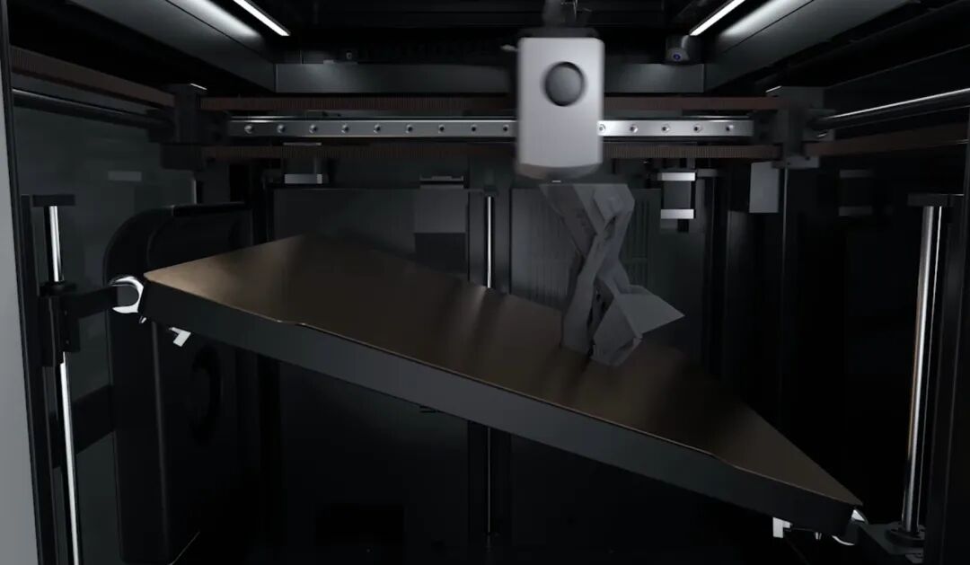 R1 最引人注目的创新在于其可倾斜的打印平台。该平台采用三点支撑机构,能够实现最大 30° 的倾斜,配合经典的 XYZ 三轴运动,构成了独特的 “五轴” 打印能力。这一设计使得打印机能够从更多角度接近打印面,官方宣称其最大无支撑悬垂角可达 75°。对于用户而言,这意味着在打印具有复杂悬垂和曲面结构的模型时,可以显著减少甚至完全不需要添加支撑结构,从而大大降低了材料消耗和后期处理的工作量,提升了打印成功率和模型表面质量。