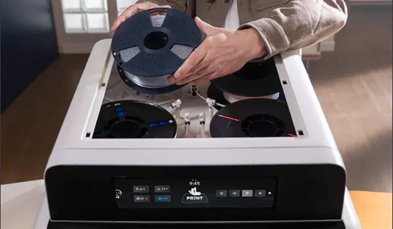 在实现技术突破的同时,R1 并未在功能上妥协。它还是一款集成度极高的四色 3D 打印机,隐藏式四路多色模块被巧妙地设计在机身顶部,使其成为目前结构最简洁的多色桌面 3D 打印机之一。针对多色打印可能产生的冲洗废料问题,TOP.E 表示其配套的切片软件能够智能拆分不同颜色区域,并结合五轴倾斜打印技术将各区域拼合成型,从而有效减少换色次数和材料浪费。此外,R1 还提供了便捷的云端切片服务,用户无需在本地安装软件,即可通过浏览器完成模型切片和打印任务管理。
