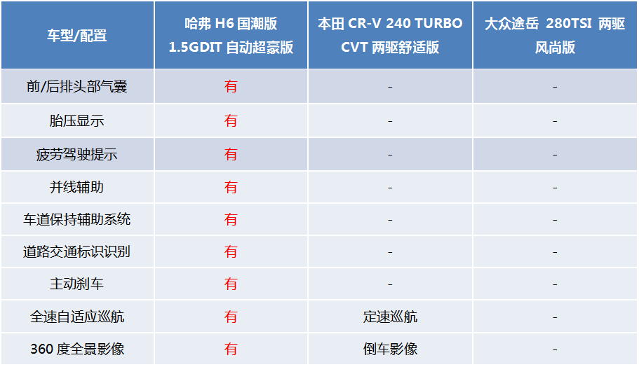 中国有句老话叫“宁当鸡头,不做凤尾”,在国人购车信仰上更是如此。作为国人,我更愿意购买自主品牌的高配车型,而非合资更贵的“丐中丐”,随着自主品牌迎来技术、品控等多方面的升级,国产汽车性能越来越强,配置也越来越丰富,只有国人当自信,国货才能当自强。综合来看,除了品牌溢价之外,本田CR-V、大众途岳车型的产品配置基本上都被哈弗H6国潮版实力碾压,这也是我选择哈弗H6国潮版的重要原因。