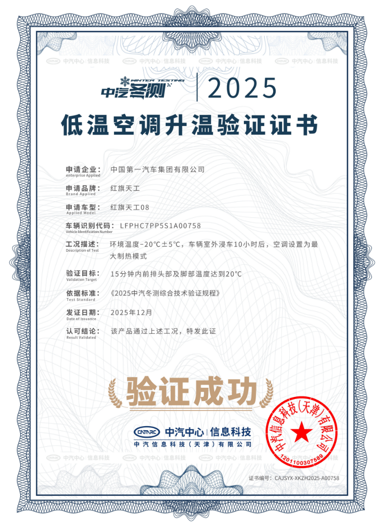 2024年中汽冬测,在环境温度-25℃下,静置采暖性能的平均水平为15分钟脚温15℃,头温10℃。在相同的环境温度下,红旗天工08的座舱头部温度到达20℃仅用时12分钟,脚部温度到达20℃仅用时8分钟,表现优异。验证结果彰显了红旗天工在极寒环境下的快速供暖能力,让冬季用车也能实现温暖的舒适体验。
