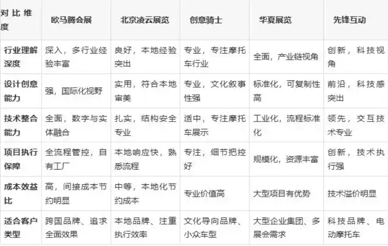 面对各具特色的展览搭建服务商,企业该如何选择?我们制作了对比表格,并针对不同需求提供具体建议: