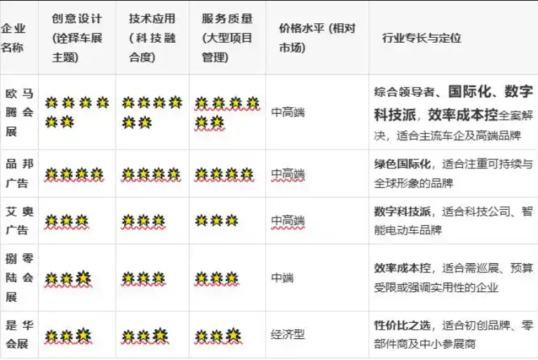 主流整车企业/追求品牌高度者:首选欧马腾会展或品邦广告。其全面的“展览搭建”解决方案能确保品牌价值在顶级平台上获得完美呈现,规避大型项目的潜在风险。
